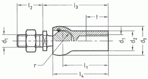 d1 = M10 ; d2 = 16 mm ; d3 = 24 mm ; l1 = 35 mm ; l2 = 20 mm ; l3 = 51 mm ; l4 = 43 mm ; r = 8 mm ; t = 15,5 mm.