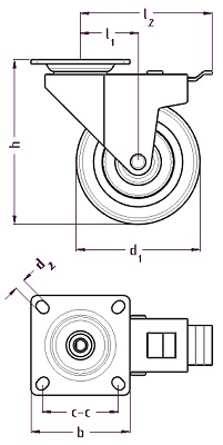 Bromsat länkhjul med nav i polypropylen och hjulbana i TPE. Gaffel och svängkrans i förzinkat stål.