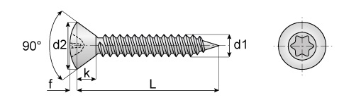 L = 19 mm ; d1 = 4,2 mm ; d2 max = 8,4 mm ; f = 1,4 mm ; k max = 2,5 mm. Bits Torx-T20