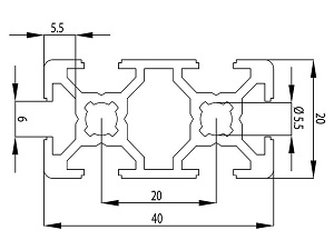 Naturanodiserad aluminiumprofil storlek 40x20 mm B-typ. Profilen har 6 T-spår som är 6 mm breda.