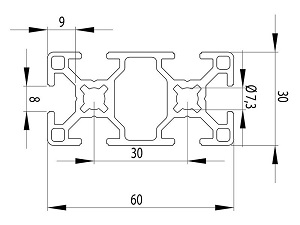 Naturanodiserad aluminiumprofil storlek 60x30 mm B-typ. Profilen har 6 T-spår som är 8 mm breda.