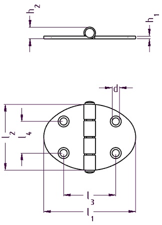 Ovalt gångjärn i polerat, rostfritt stål med försänkta hål.