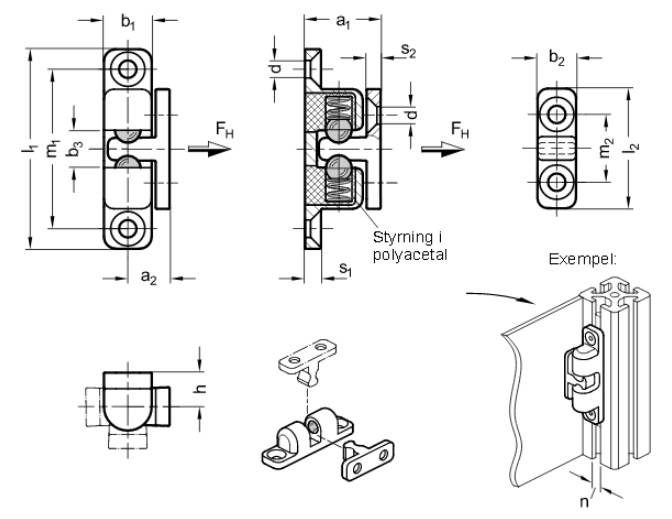 Snäpplås i svartlackerat zinktryckgods med kulor och fjädrar i rostfritt stål. Styrning i Polyacetal.