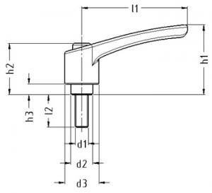 Ställbar låsspak i glasfiberarmerad svart termoplast (matt struktur) med insats i brunerat stål, utvändig gänga.